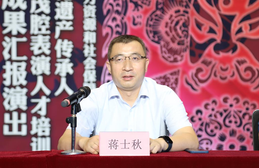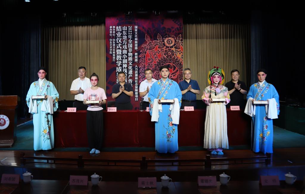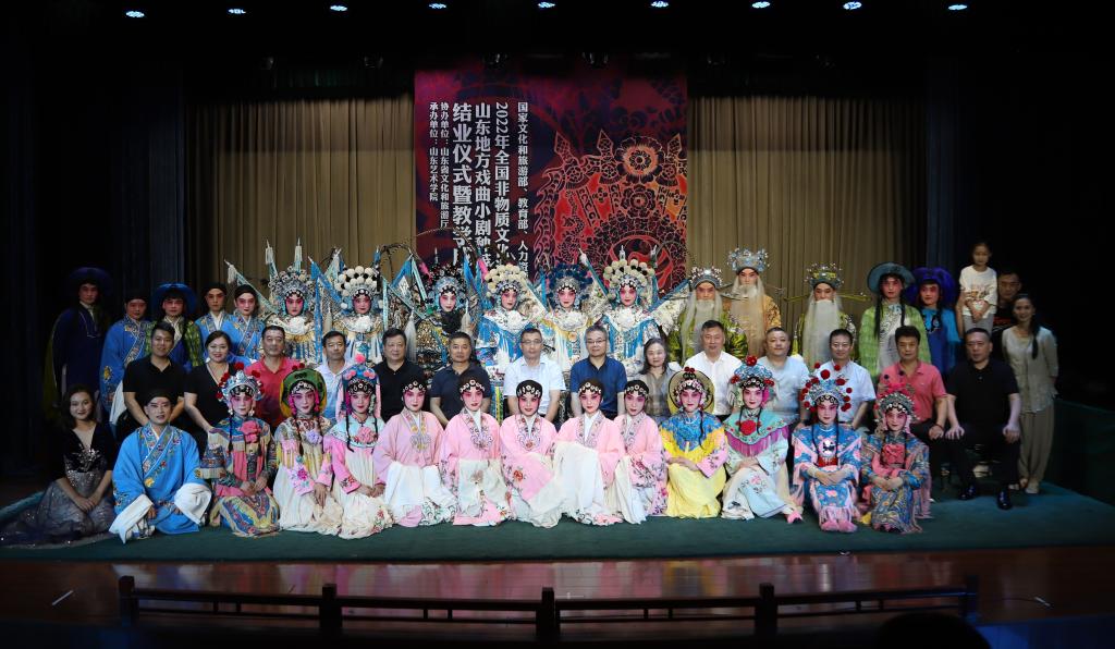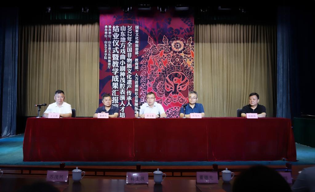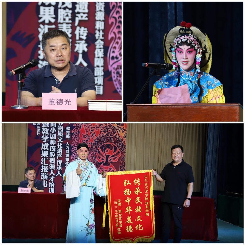 7月30日,2022年国家文化和旅游部全国非物质文化遗产传承人研修研培计划项目——山东地方戏曲小剧种茂腔表演人才培训班结业仪式暨汇报演出在我校长清校区梨园剧场举行。山东省文化和旅游厅非遗处副处长蒋士秋,学校党委委员、副院长苏茂兴出席并致辞,戏曲学院负责人,青岛、胶州、高密三地茂腔剧团负责人,培训班全体学员参加活动。
