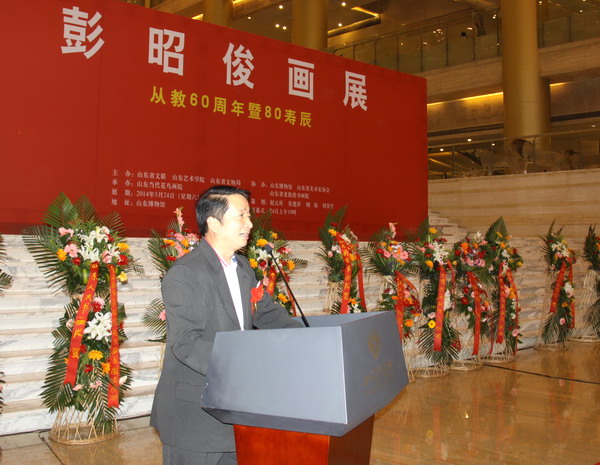 院长张志民在开幕式上致辞。他代表山东艺术学院和山东省美协首先向彭昭俊从教60周年暨80寿辰画展开幕表示祝贺。他说,彭昭俊先生一生培养了大批画家、艺术家,桃李满天下,对山东美术教育事业做出了贡献。彭先生80岁了还在坚持作画,对时代对国家积极奉献,为我们做出了榜样。我们应该向彭先生学习,学习他们这一辈人的精神境界和严谨的治学为艺精神。张志民院长还向彭老师的辛勤教诲和培育表示感谢,并祝愿老师身体健康,艺术青春常驻。