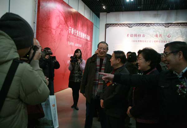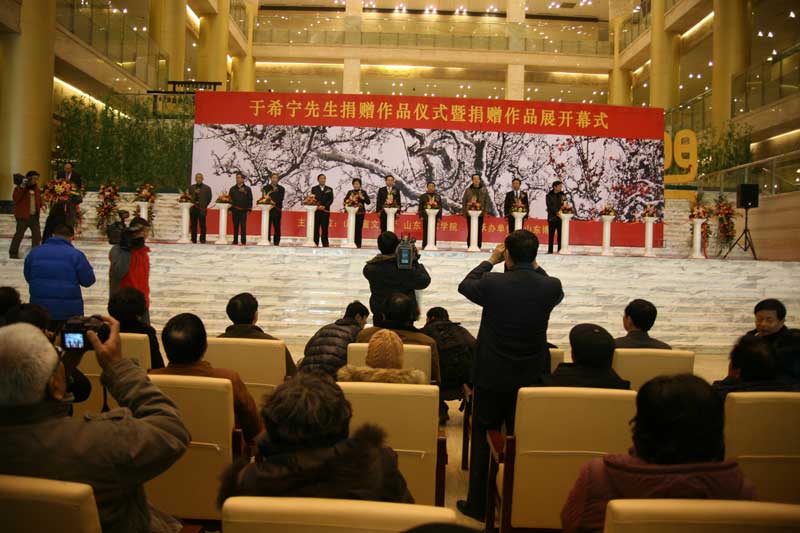 1月16日上午10时,国画艺术大师、原我校名誉院长于希宁先生捐赠作品仪式暨捐赠作品展在山东博物馆隆重开幕。十一届全国人大常委会委员、全国人大财政经济委员会副主任委员韩寓群;省委常委、省委宣传部部长孙守刚;原副省长、省人大常委会副主任邵桂芳;省人大常委会副主任、山东大学党委书记朱正昌;省人大常委会副主任时立军;省人大常委会副主任、省总工会主席刘玉功;省政府副省长黄胜;省政协副主席齐乃贵;省高级人民法院院长周玉华;省委宣传部副部长刘为民;省政府副秘书长司安民;省文化厅厅长亢清泉;省委组织部副部长、省国资委党委副书记于刚;省人大代表资格审查委员会主任付新元;我校党委书记柳文敏、院长张志民,副院长胡德定、王力克、刘晓静以及省内外文化艺术界的广大嘉宾朋友出席仪式。仪式由省文化厅副厅长、省文物局局长主持。