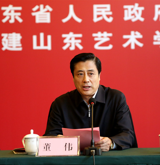 他代表山东省人民政府对文化部多年给予山东省文化、教育事业的关心支持表示衷心感谢,对山东艺术学院表示祝贺。他指出,省部共建山东艺术学院,是文化部和山东省政府加强合作的重要成果,必将对山东高等艺术教育发展、文化艺术高层次人才培养和文化繁荣发展,产生重要深远的影响。山东省将认真履行共建责任和义务,进一步加大扶持力度,为学院在人才培养、艺术创作研究、创作成果转化等方面提供更好的条件,创造更加优越的环境。希望山东艺术学院以此为契机,深化改革创新,加快内涵发展,创新推动人才培养、艺术研究和文化传承创新等各项工作。希望文化部不断加大对山东艺术学院的支持力度,建立扶持其研究、创作、生产、传播和人才建设的长效机制。通过各方共同努力,将山东艺术学院建设成为重要的文化艺术人才培养基地、创作研究基地和成果转化基地。