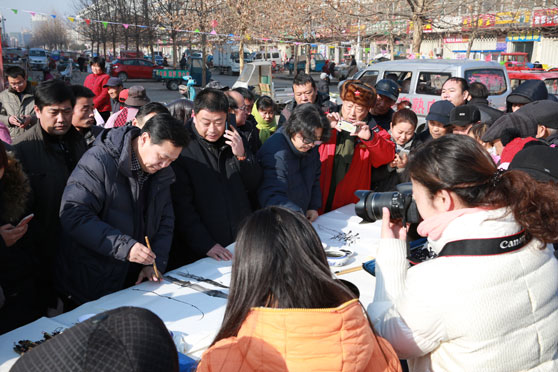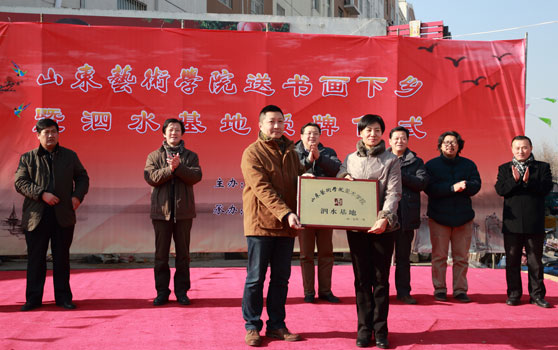 仪式上,高启光副院长代表学校与泗水县政府签订合作协议,美术学院负责人向泗水县授实践基地牌额,美术学院马麟春教授代表学校向当地文化局赠送国画作品,国画系教师当场挥毫泼墨,为现场群众义务作书画和春联30余幅。