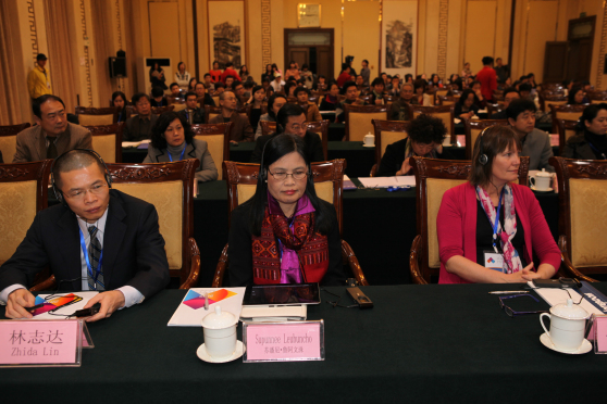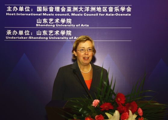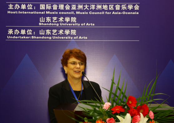 国际音理会秘书长silja Fischer(希尔亚•菲舍尔)致词。silja Fischer秘书长说,亚太民族音乐学会第十七届国际学术研讨会是区域集团化的、最适当的集合亚洲-大洋洲地区所有成员的机构。目前,在亚太地区的多种音乐表达形式不仅反映出了包括地区以及民族分支内人们之间的跨文化交流在内的古代历史事件的影响,并且反映出了通过对西方音乐在他们对从殖民时期到现在所保留下来的剧目实践这一因素继续适应和同化的过程中完成对音乐新形式的演变。她说,2013年11月,下一次国际音乐理事会论坛将在澳大利亚的布里斯班举行,这次会议理所应当将是五年研究项目的一个总结会议。她利用此次良机诚挚地邀请与会代表参加继洛杉矶、北京、突尼斯以及塔林之后的第五届国际音乐理事会论坛。