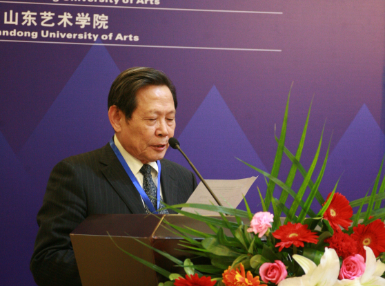 亚太民族音乐学会会长王耀华致词。致词中,王耀华会长代表亚太民族音乐学会全体理事对为本次会议筹备工作作出巨大贡献的山东艺术学院领导、师生和全体工作人员致以深挚谢忱,并简要介绍了亚太民族音乐学会成立以来的工作情况和为推动相关领域学术研究事业的发展所起的重要促进作用,介绍了本次学术研讨会的议题。王耀华会长指出,“艺术无国界,探索无止境”。本次会议的召开,对于促进亚太地区传统音乐学的学习、交流、研究与实践,更加广泛地传播世界先进文化,促进人类文明的繁荣与发展,都具有深远的历史意义和重大的现实意义,并相信,各位专家深入的交流与探讨,将会带来更多新观念和新思路,结出更加丰硕的学术研究新成果。