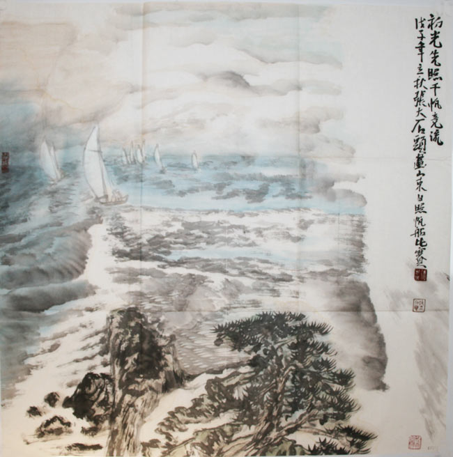 据悉,神7搭载的“和平颂——神七太空飞行艺术之旅”共316幅作品,涉及人物画、山水画、花鸟画和书法、篆刻作品各60幅,特别作品16幅,这些作品将于中华人民共和国成立60周年之际在国内外进行巡展,并出版《和平颂》大型精装画册。 张志民院长创作的《初光先照千帆竞流》表达了对第29届奥运会在北京成功举办和神舟七号载人航天飞船发射盛事的美好祝愿以及对祖国的大好河山的赞美,更体现了中国人民追求和平的美好愿望。