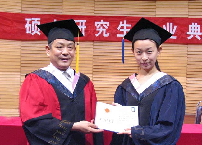 图片二:张志民院长向毕业的硕士研究生颁发硕士学位证书。