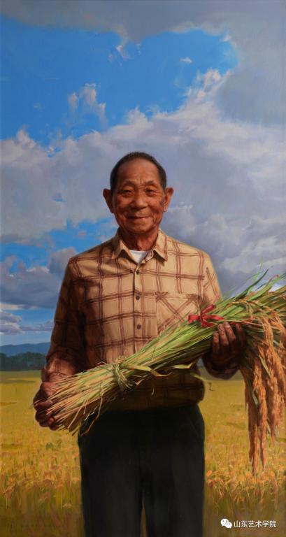 油画的优势在于现场感的体现,因为它能够表达空间和强烈的色彩。以刻画袁隆平的这幅作品为例,人物后面的远山是青灰色的,前边的树是绿灰色的。从远山到前边的稻田有3公里的距离,透视如果推不回去,远山就像是紧贴在袁隆平后背上一样,画面效果并不好。在我看来,中国画不适合表现这种大透视的景象。在色彩方面,同样以这幅画为例,假如黄色水稻和蓝天的纯度达不到要求,画面效果也会大打折扣。比如还是用同样的构图来画同样的形体,我们把它拍成照片之后去掉颜色,再画在宣纸上,然后填上中国画颜色,完成之后,两幅作品近看好像一模一样,退后20米或者50米后再看会发现油画的空间感更强。