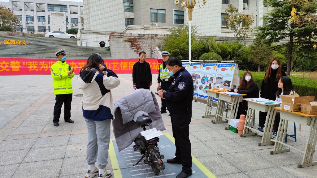 11月10日、11日,长清交警大学路中队走进山艺校园,开展“我为师生办实事”电动自行车登记上牌便民服务活动。长清交警大学路中队队长董梁,保卫处负责人和有关工作人员参加现场活动。