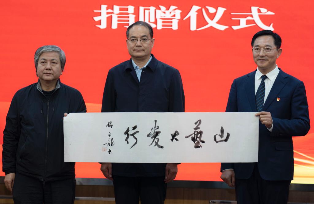 在公益题材书画作品捐赠环节,中国书法家协会副主席、山东省书法家协会主席顾亚龙教授现场创作了书法作品“山艺大爱行”,美术学院、传媒学院师生共同精心创作了油画、中国画作品。王洪禹代表学校将六件书画作品捐赠给长城爱心大本营,刘长城接受捐赠并回赠了受捐证书。爱心捐赠是山东艺术学院立足专业学雷锋,弘扬雷锋精神、开展社会服务的一次生动体现,捐赠的作品也充分体现了学校在学雷锋活动中的艺术专业优势和人才资源优势。