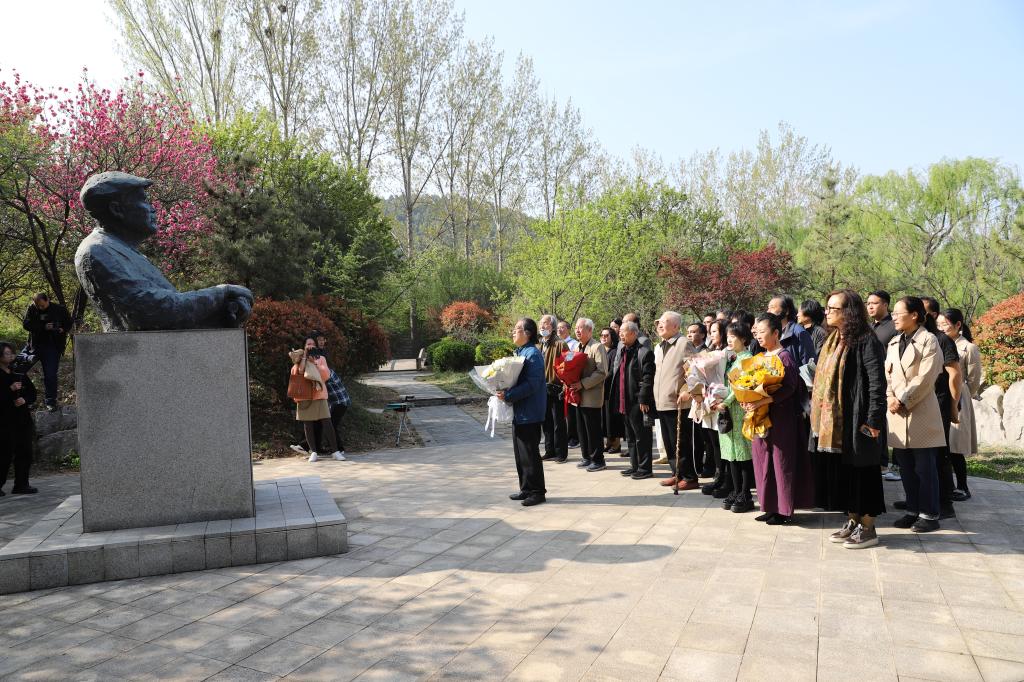 刘曦林回访母校期间,与我校1958级校友朱守聚、陈汉民、王振兴、崔鉴到梅园瞻仰于希宁先生雕像并敬献鲜花。