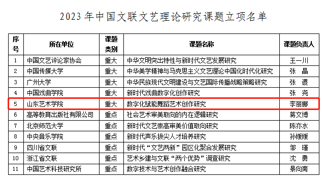 6月20日,中国文联发布了《2023年中国文联文艺理论研究课题入选公告》,我校李丽娜副教授申报的《数字化赋能舞蹈艺术创作研究》获批重大课题立项,是山东省唯一入选项目。