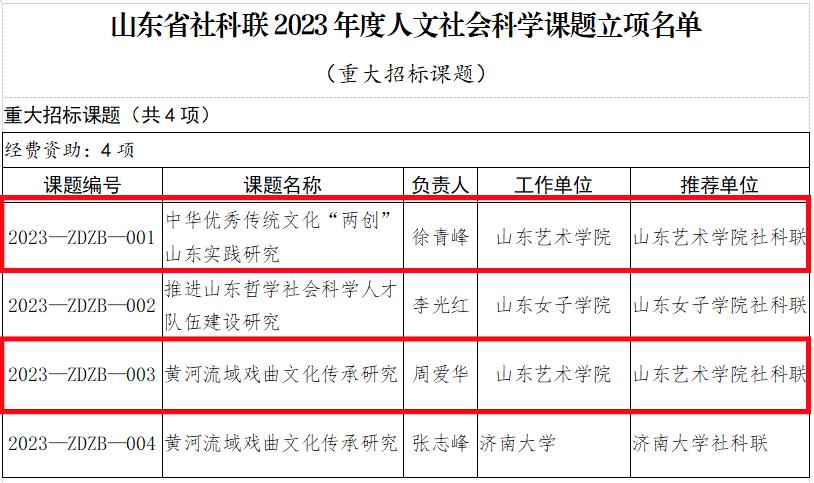 近日,山东省社会科学界联合会公布了2023年度山东省人文社会科学课题立项名单,我校徐青峰教授团队的“中华优秀传统文化‘两创’山东实践研究”、周爱华教授团队的“黄河流域戏曲文化传承研究”2项课题喜获“重大招标课题”立项,立项数量在全省“2023年度人文社会科学重大招标课题”立项总数(4项)中占比50%,位居全省首位。
