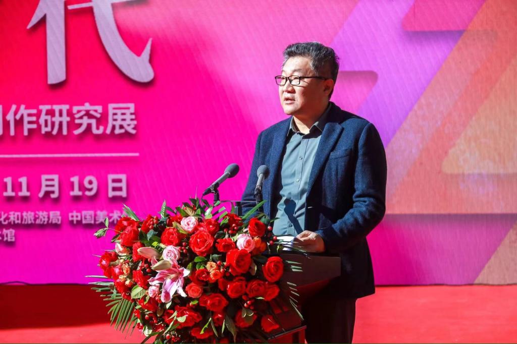 10月20日,由文化和旅游部艺术司、青岛市文化和旅游局、中国美术馆共同举办的“丹青赋彩新时代——国家主题性美术创作研究展”在青岛市美术馆开幕。文化和旅游部党组成员、副部长卢映川,山东省副省长邓云锋出席开幕式并共同为展览启幕。全国政协副秘书长、民盟中央副主席、中国美术馆馆长吴为山,中国国家画院党委书记燕东升,青岛市副市长赵燕,山东艺术学院院长、山东省美术家协会主席徐青峰分别致辞。文化和旅游部艺术司副司长何亚文,中央文化和旅游管理干部学院党委书记喻剑南,山东省政府办公厅副主任刘斯杰,山东省文化和旅游厅党组书记、厅长王磊,青岛市文化和旅游局局长潘峰出席开幕式。开幕式由文化和旅游部艺术司司长明文军主持。