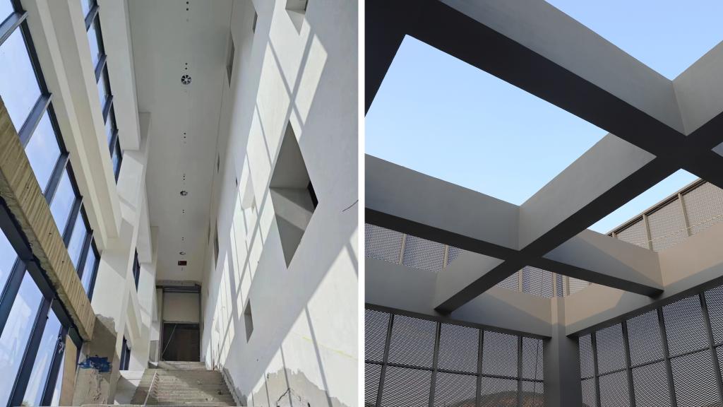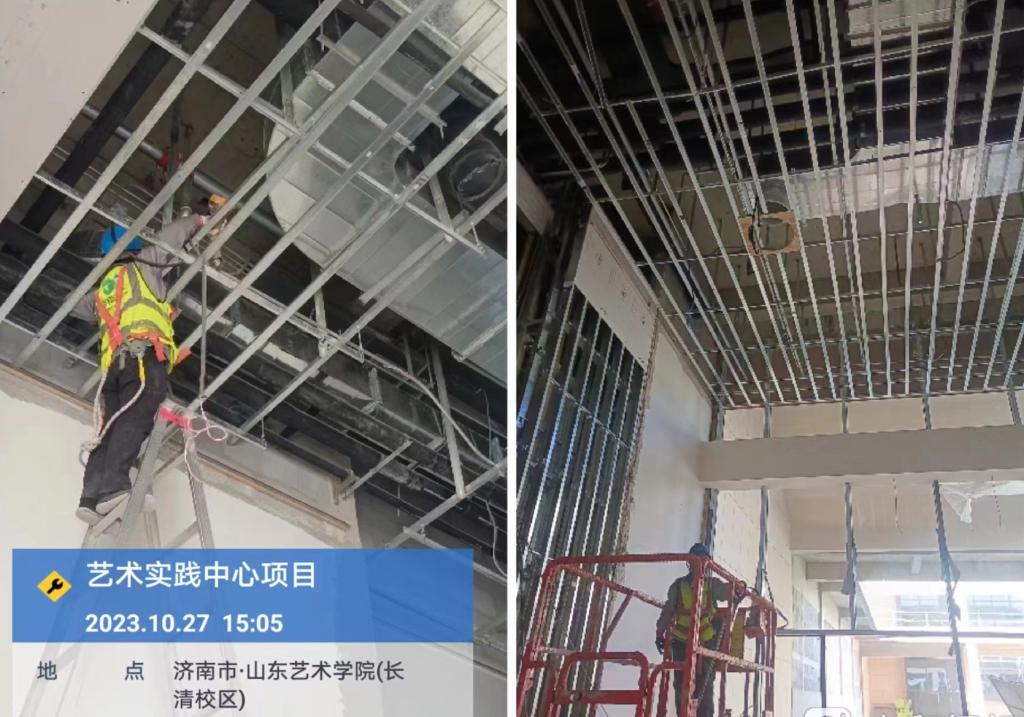 在学校和济南城市建设集团的积极推动下,项目组同各参建方通力配合,全力以赴。历经5个月的日夜奋战,挂图作战,作为项目主体的美术馆和剧场已展现出雏形。目前外立面幕墙基本完成,美术馆室内精装修和安装工程接近尾声,剧场精装修单位已进场施工。