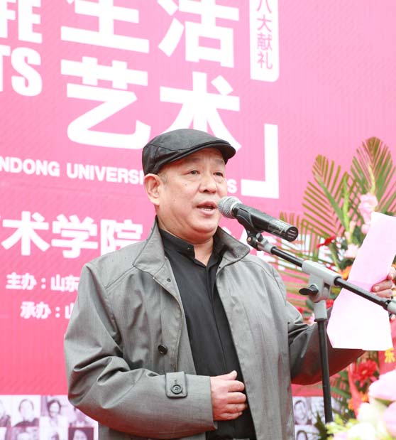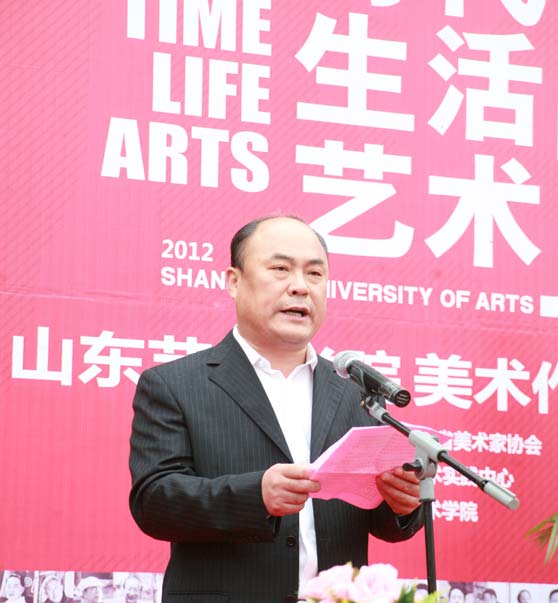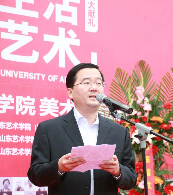 开幕式上,山东艺术学院党委书记任运河致辞。他指出,党的十八大将于11月8日隆重开幕。在这一具有深远意义的重大历史时刻,山东艺术学院师生以美术作品展的形式向党的十八大献礼,用饱含深情的笔墨丹青讴歌多彩时代、描绘壮丽齐鲁、赞颂富美中华,用丰富多彩的艺术画卷展示了创作者对美好生活的自觉认同、深刻体验和无限热爱。他强调指出,当前,在我省加快文化强省建设步伐、推动文化大发展大繁荣的战略机遇期,山东艺术学院以更加务实进取、更加积极作为的姿态担负起了时代赋予的光荣使命。近期在学校制定的《山东艺术学院服务山东文化强省建设行动计划》的引领下,学校师生圆满完成了第三届亚洲沙滩运动会开闭幕式演出、“齐鲁巡礼——西方画家眼中的山东”大型系列艺术创作活动、第四届山东文化创意产业博览会等重要任务,并在紧锣密鼓地排练原创舞剧《柳泉寻踪》,参加全省十艺节剧目选拔,还将隆重推出纪念于希宁先生诞辰100周年系列纪念活动。学校师生在各艺术领域全面出击,收获了一个又一个丰硕的成果;在备战“十艺节”、服务山东文化强省建设的道路上,留下了一串又一串扎实稳健的足迹。他表示,学校将以这次美展为契机,全面贯彻“二为”方向、“双百”方针,促进学校文化传承创新能力不断增强,艺术创作水平不断提高,服务山东文化强省建设领域不断拓展,为时代和人民群众奉献更多的精品力作,为促进社会主义文化大发展大繁荣培养更多优秀人才,为实现山东艺术学院创建山艺特色、山东风格、国内一流的高水平综合性艺术大学的宏伟目标而不懈奋斗。