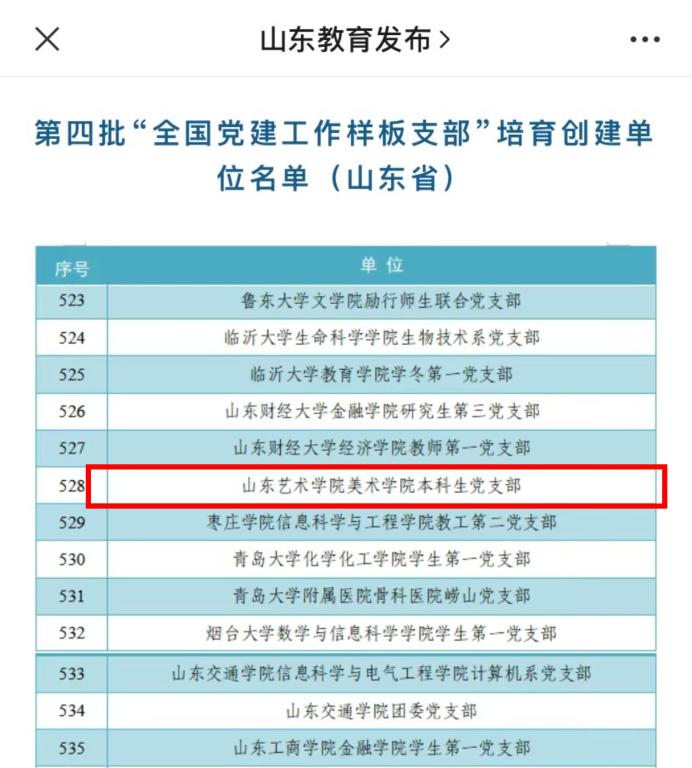 近日,教育部思想政治工作司发布了《第四批新时代高校党建示范创建和质量创优工作遴选结果的公示》,我校美术学院本科生党支部成功入选第四批“全国党建工作样板支部”培育创建单位。这是学校首次入选“全国党建工作样板支部”培育创建单位,实现了学校党建“双创”新突破!
