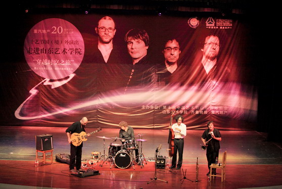 19时30分,音乐会正式开始。在演出过程中,四位演奏家密切配合,带来了一场时而舒缓、时而欢快、时而激昂的音乐盛宴。乐团的精湛演奏让到场的观众沉醉于优美的旋律之中,现场不时响起热烈掌声,尤其是该乐团重新改编并深情演奏的《沂蒙山小调》,最受观众喜爱。据了解,在竭力保持原有旋律的基础上,亚尼克·瑞约对两首山东民谣《沂蒙山小调》和《谁不说俺家乡好》进行了极具创造性的改编,通过对乐谱顺序、音符、旋律的重新调整,赋予了两首曲子更加舒缓、悠扬、柔和的爵士风味。