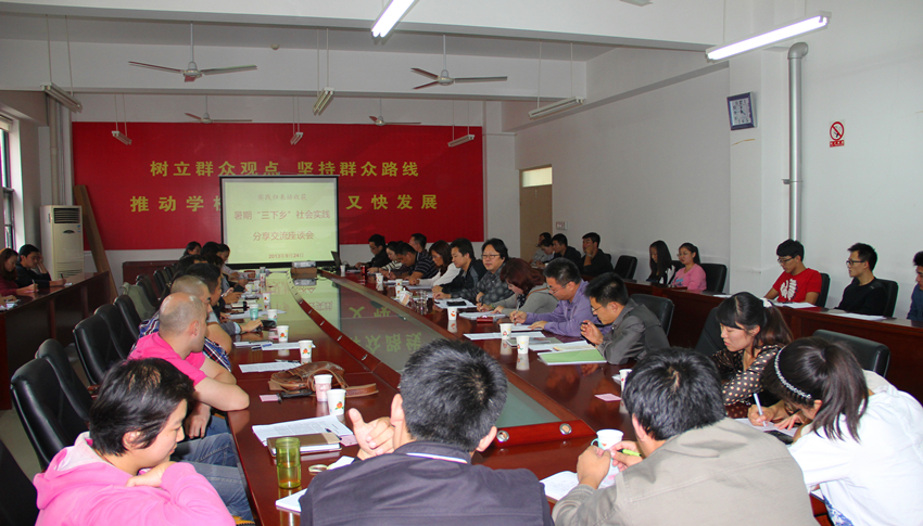 9月24日下午,我校“实践归来话收获”2013年暑期三下乡社会实践成果分享交流座谈会在长清校区办公楼二楼会议室举行。副院长王力克出席座谈会,相关部门负责人,各二级学院党总支和团总支负责同志、社会实践带队老师及学生代表共60余人参加座谈会。座谈会由团委负责人主持。