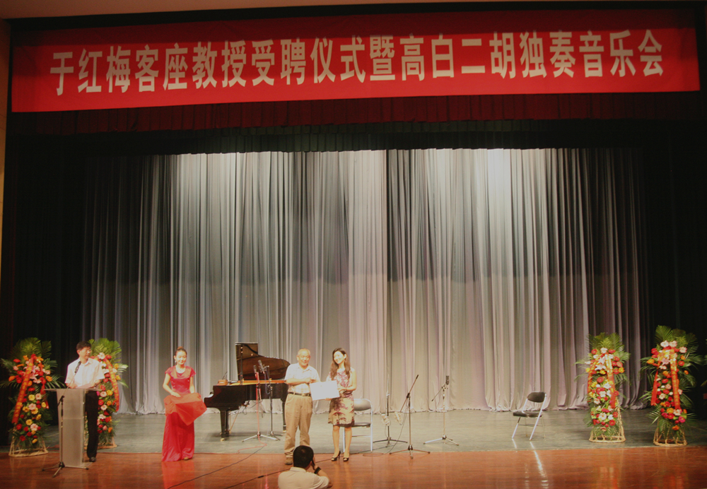 6月8日晚,我校聘任中央音乐学院民乐系主任于红梅教授为客座教授的聘任仪式暨弟子高白二胡独奏音乐会在文东校区艺术剧场隆重举行。省文化厅副厅长李国琳,济南市副市长巩宪群,省文联副主席张桂林,校党委书记任运河,院长张志民,副院长高启光出席聘任仪式并观看音乐会。张志民院长为于红梅教授颁发聘书,音乐学院负责人致辞,仪式由人事处负责人主持。