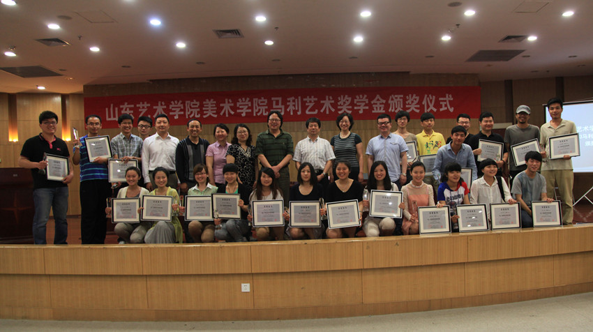 大会首先由美术学院负责人介绍此次奖学金的评选过程,并宣读了获奖作品名单。出席大会的领导为23名获奖同学颁发了获奖证书、奖杯。