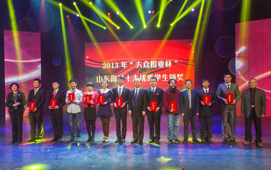 本次晚会一并为刚刚揭晓的2013年山东高校十大优秀学生颁奖。山东高校十大优秀学生评选活动得到了大众报业集团长期的大力支持,至今已经连续举办了13届。在各高校层层选拔推荐的基础上,经过专家组对全省高校推荐的101名候选人进行认真评选、审核,并报评选活动领导小组审定,省高校工委决定授予山东大学冯学知、中国海洋大学侯杰、曲阜师范大学桑哲、山东中医药大学骆帝、济南大学田世禄、山东财经大学姜文超、山东艺术学院尹文菁、聊城大学东昌学院李根、山东商业职业技术学院徐浩翔、山东电子职业技术学院张弋等10名同学2013年“大众报业杯”山东高校十大优秀学生荣誉称号,中国石油大学(华东)张腾等30名同学获得2013年“大众报业杯”山东高校十大优秀学生提名奖。省委高校工委副书记黄琦、省教育厅副厅长宋承祥、山东大众报业集团副总编辑赵念民、我校院长张志民为山东高校十大优秀学生颁奖。