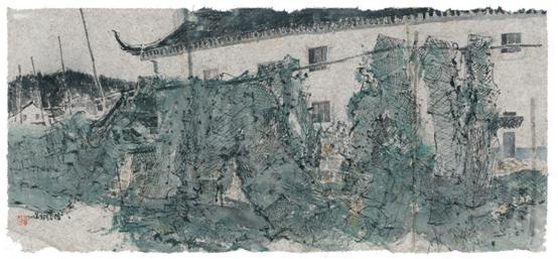 董俊超喜爱写生并心醉于写生所特有的生动性。“棉麻纸”、“手工纸”是艺术家最常用的材料,这些纸张与水的融合造成了一种涩而不干的独特效果,纸张的厚度又使得艺术家能够在其上施展更多的肌理表皮。除了对材料的探求,董俊超作品中更为打动人的,是他在笔墨线的勾勒中,没有怠慢每一棵树的造型、屋檐瓦片的残损、渔民晾晒渔网的经纬⋯⋯这种“师法于自然”的不苟,让这些平凡的景致在挪移到画纸上的瞬间变得不再一般,并且有了更多的温度与人本的关照。看董俊超的作品感觉生动而朴实,这或许来源于艺术家善于运用不同绘画材料以及他对自然的尊重。