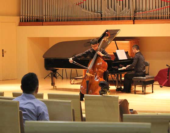 近日,2012第一届中国国际低音提琴音乐节暨卡丹萨国际低音提琴比赛在中央音乐学院举办。来自美国、德国、捷克等国家和地区的演奏家以及国内知名低音提琴教育家、演奏家共四十余人作为特邀专家参加了此次低音提琴的盛会,国际著名低音提琴演奏家Nicholas Walker、Silvio Dalla Torre和著名旅美低音提琴演奏家张达寻等应邀担任比赛评委。我校音乐学院2010级研究生陈天航同学获专业青年组“优秀表演奖”。
