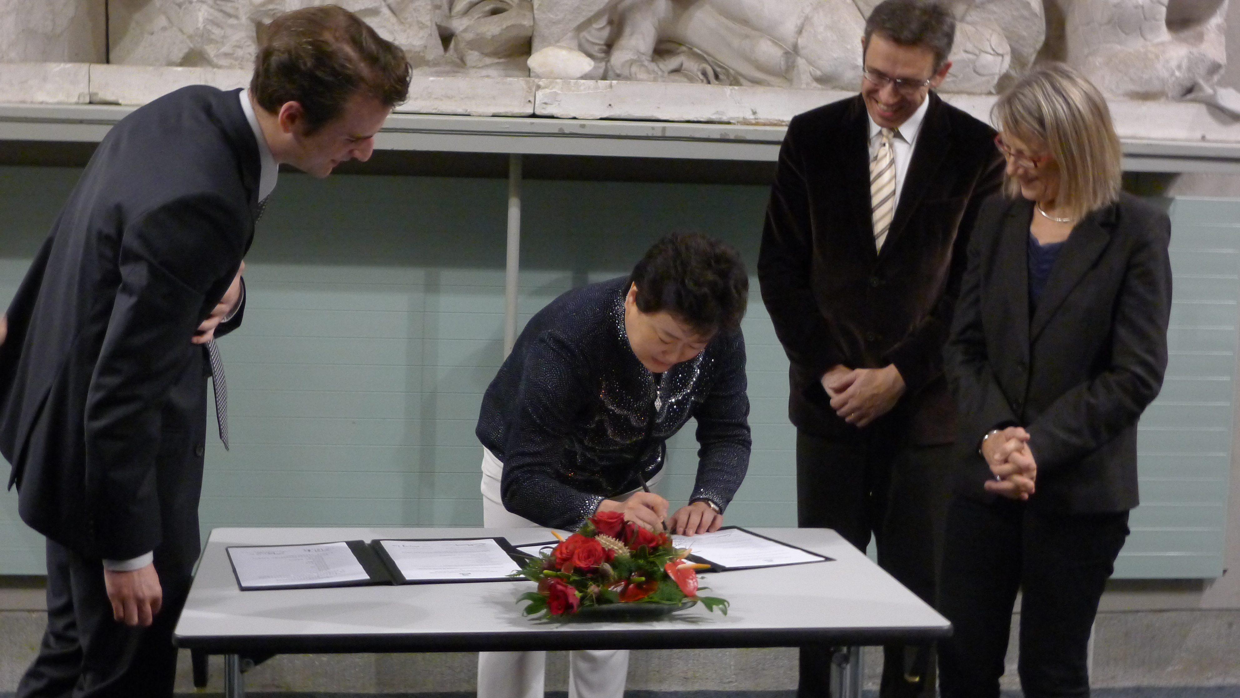 当地时间10月16日晚,在观赏完布列塔尼音乐学院专为代表团举办的欢迎音乐会后,两校签订正式友好合作交流协议仪式在布列塔尼音乐学院音乐厅举行。布列塔尼音乐学院院长贝诺瓦•宝马哥特内先生,布列塔尼省首府雷恩市副市长、外事办主任乐•弗朗斯瓦女士,雷恩市济南市交流协会项目负责人玛丽•居亚尔女士及相关专业教师出席签字仪式。仪式上,贝诺瓦•宝马哥特内院长、乐•弗朗斯瓦女士先后致辞,对代表团的到来表示欢迎,并分别介绍了布列塔尼音乐学院和雷恩市的基本情况。接着,刘晓静副院长发表讲话。她首先对雷恩市、布列塔尼音乐学院的热情招待和周到安排表示感谢,并简要介绍了我校的基本情况。她同时讲到,中法两国都是拥有深厚文化和辉煌艺术的国家,山东省和布列塔尼省、济南市和雷恩市多年来保持密切合作关系。现在,山东艺术学院和布列塔尼音乐学院又正式建立友好合作校际关系,必将推动两省、两市和两校艺术教育和文化交流活动的深入开展。随后,刘晓静副院长代表学校与贝诺瓦•宝马哥特内院长郑重签署了两校正式友好交流合作协议书,并互赠礼物。根据协议,两校本着相互平等、共同发展的原则,将在人员交流(教师交流、学生交流、互换学生交流)、学术交流(学术讲座、共同举办音乐会、共同研究课题)、教学交流(教学研究资料及信息的交流、教材的互换)等方面开展广泛深入的交流合作。
