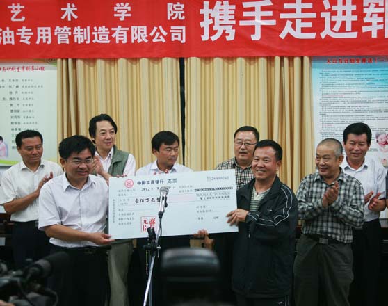 仪式上,张志民院长与齐元臣董事长现场展示为黄集乡人民绘制的大幅作品,并将100元万人民币支票交到黄集乡党委书记王永合和我校驻村“第一书记”王书豪手中。张志民院长在仪式上讲话。他指出,山东艺术学院党委响应省委省政府的号召,派出三位驻村“第一书记”,和郓城县、黄集乡的领导们共同为当地老百姓做些实事,体现了我党一贯的作风,这符合我们各级党组织和政府的工作方针,也符合我们山东艺术学院一直以来为山东地域经济文化建设做贡献的方针;齐元臣董事长热心社会公益事业,积极参与山东艺术学院为地方经济文化建设和驻村“第一书记”工作做贡献的愿望和活动,本次活动就是企业家和艺术家非常友好、和谐、共赢合作的案例。张志民院长强调,近年来,山东艺术学院包括美术、音乐、戏剧、舞蹈等专业在内的艺术家们,一直在为山东省乃至全国的经济文化建设做着无私的贡献,黄集乡憨厚、朴实的老百姓让艺术家们深深感到,为官就应该善良,就应该为老百姓做点实事;从艺就应该真诚,对得起时代,对得起自己,要把自己的艺术才华更多地奉献给社会,奉献给热爱艺术的朋友们。张志民院长说,在党的十八大胜利召开之际,举办这次书画笔会和捐赠义卖活动,既是对黄集乡老百姓献出一份爱心和对驻村“第一书记”工作的支持,也是向党的十八大胜利召开献礼。