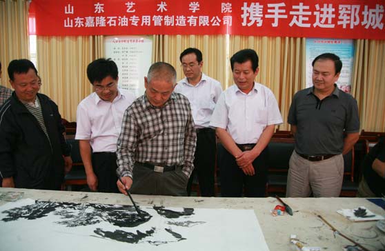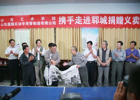 9月20日下午,我校携手山东嘉隆石油专用管制造有限公司走进郓城书画笔会暨捐赠义卖仪式在菏泽市郓城县举行。我校院长、山东省美术家协会主席张志民率领我校刘玉泉、韩菊声、李济民、马麟春、王兴堂、侯弟坤、党震、郭兴旺等著名教授、画家出席笔会,山东嘉隆石油专用管制造有限公司董事长齐元臣、郓城县和黄集乡党政负责人、我校党办院办和组织部负责人以及3位驻村“第一书记”参加笔会。