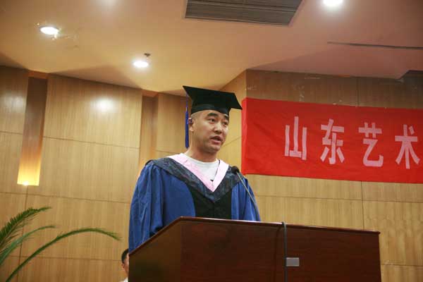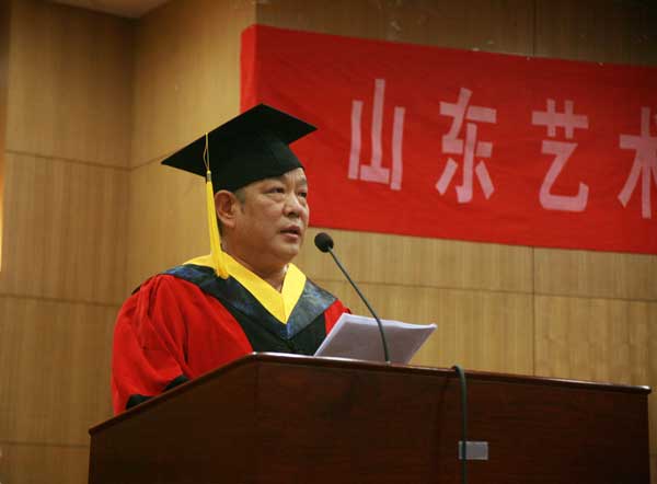 张志民院长在典礼上讲话。他首先代表学校领导和全体师生向经刻苦学习、勤奋实践获得硕士学位的154位同学表示热烈的祝贺。他简要回顾了我校研究生办学情况,指出我校自1999年招收首届“科学学位”研究生以来,研究生教育事业取得飞速的发展,尤其近两年,我校的研究生教育按照“坚持科学发展、强化内涵建设”的指导思想,不断推进学位与研究生教育的服务和管理工作。2011年,我校研究生培养中的三大支柱学科——音乐、美术、戏剧,又被教育厅评为全省“十二五”规划的重点学科;2012年我校在职艺术硕士招生计划较往年有了较大突破。我们的毕业生也正在国家的文教及其它领域中发挥着越来越重要的作用,他们以突出的艺术成就和艺术理论研究成果,以及显著的工作业绩,赢得了社会的广泛赞誉,印证了山东艺术学院过硬的研究生教育水平和培养质量。他希望同学们第一要心存理想、做一个求知者。第二要端正人品,做一名生活的强者。第三要热爱生活,做一名感恩者。并寄语同学们牢记母校“闳约深美”的校训,毕业后在各自的艺术领域里不断取得新的佳绩,为母校赢得更大的荣誉,为社会做出更大的贡献。