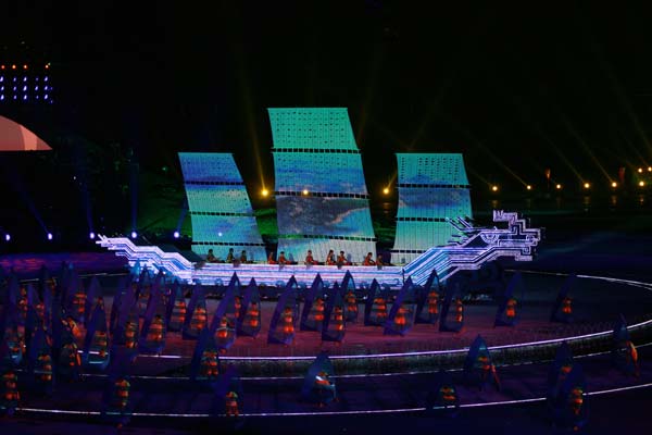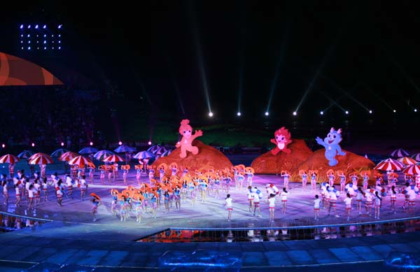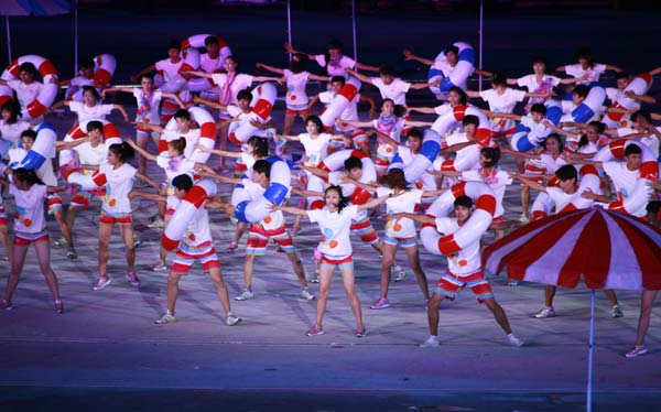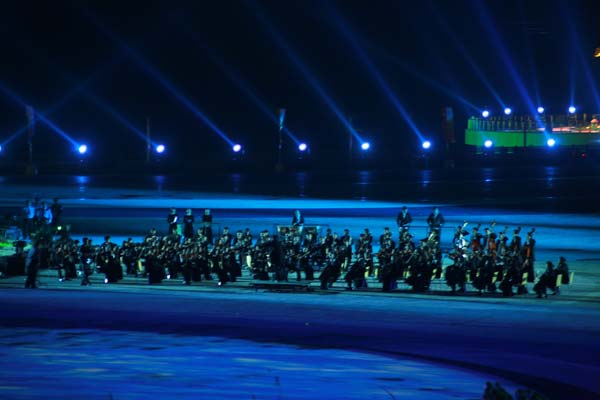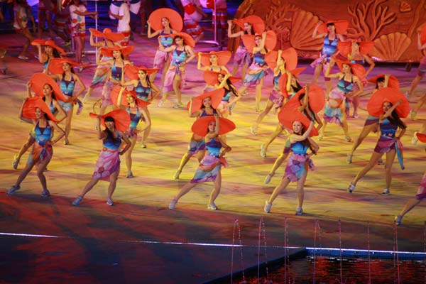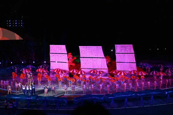 海阳亚沙会是中国继北京奥运会、广州亚运会和深圳大运会之后举办的又一个令人瞩目的国际体育盛会,也是中国第一次由县级城市举办的洲际比赛。开幕式上进行了名为“碧海金沙的交响”文艺演出,演绎了“海韵、阳光、激情、时尚”的理念。整场演出以“大海与金沙的交响、运动与时尚的和谐”为主线,分“金沙梦想、大海欢歌、激情飞扬、快乐相聚”四个篇章。最后,歌手曹芙嘉高唱第三届亚沙会主题曲《快乐在一起》,在欢快的旋律中文艺演出落下帷幕。我校舞蹈学院350名师生承担了开幕式文艺演出全部舞蹈演出任务,由音乐学院、音乐教育学院、职业成教学院、戏曲学院120余名师生组成的交响乐团承担了开幕式序曲《碧海金沙的交响》的现场演奏,广受好评。