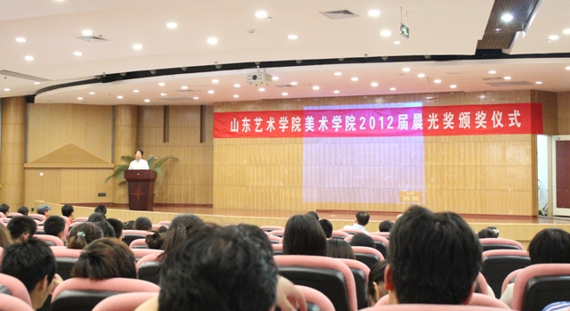 6月20日下午,我校2012届“美院晨光奖”颁奖大会在图书馆报告厅举行。王力克副院长,图书馆、教务处、美术学院相关负责同志出席了此次颁奖大会,并为获奖学生颁发了“美院晨光奖”证书及山东艺术学院作品收藏证书。大会由美术学院相关负责同志主持。