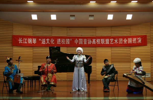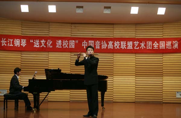 艺术团成员来自内蒙古民族大学、上海音乐学院、中央音乐学院、长春大学、大连大学等高校,为现场观众表演了精彩、丰富、多样化的节目,提供了很好的交流和学习平台。作为本次全国巡演的第二站,我校音乐学院的4名师生作为特邀嘉宾为师生奉献了精彩的曲目,展现出良好的专业素养和艺术情操。其中,陈家贝、于莉莉老师的钢琴四手联弹《翻身的日子》,在令人耳目一新的同时,带领观众重温中国社会波澜壮阔的变革和中国人真正过上了“翻身的日子”的喜悦和豪迈心情;研究生陈彦润的柳琴独奏《剑器》,让大家仿佛置身公孙大娘舞蹈雄健刚劲的姿势和淋漓顿挫的节奏中;研究生潘永刚的笛子独奏《早晨》,描写了春天的早晨,太阳从东方升起,小鸟在树上歌唱,孩子们在森林中欢乐地游戏的美妙生活情景。