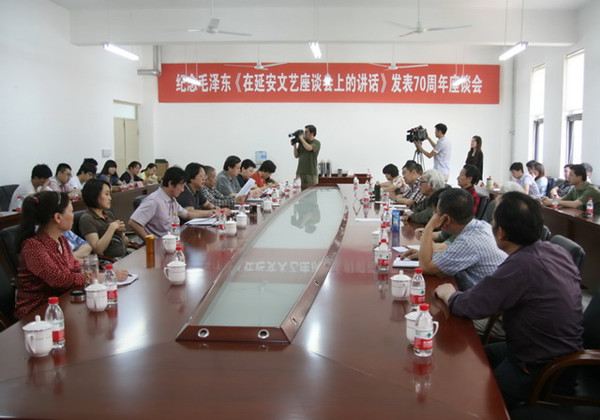 座谈会上,与会人员一同围绕《讲话》的历史背景、指导作用、艺术思想以及遵循讲话精神办学、艺术服务大众等方面,进行了深入的座谈交流。单应桂教授在座谈中讲到,《讲话》反映了毛泽东哲学思想在文艺方面的运用,他抓住了文艺发展的规律,同样,搞教学要掌握教学规律,搞创作要讲究创作规律,如果运用了规律,就是放之四海而皆准的道理。对讲话最深刻的理解就是艺术源于生活,毛泽东运用他的哲学思想把艺术与生活的关系更上升了,如果一个艺术家作品不扎根生活,他的艺术就会枯萎,就会无病呻吟,古人讲“笔墨当随时代”与《讲话》道理相通。艺术经过加工、过滤、提升,比生活更高、更美、更概括、更有指导意义,艺术源于生活,高于生活,是对生活的理解上升了,典型化了,这样的作品才有指导意义,艺术应该比生活更美。作为艺术院校应该好好研究艺术规律、教学规律,在教学当中体现艺术规律,规律掌握了,创作也就自由了。李振才教授讲到,从艺专到现在,为人民服务,为群众服务,是学校主要的教学和创作的主题,从教学到创作的思路都在遵循《讲话》精神。作为学校来说,学生的基本功很重要,但创作也很重要,比如说音乐作曲,美术创作都要抓住主题,要去体验生活,才能有好的创作。学校应该把创作列入发展规划,把创作放到教学的重要位置,应该发挥集体力量,组织创作人才,发挥他们的作用,戏剧、音乐、舞蹈、美术等专业都要注重创作,这样学校特色才会显现出来,影响力也会扩大。安禄兴教授在发言中说,特色是艺术学院能够取得独立生存的法宝,也是取得发展的重要法宝,学校经过50多年的发展,充分表明哪个专业有特色,哪个专业就有发展,只有发挥特色才有巨大的发展。特色就是人民所欣赏、所需要的,目前,学校重视人才、专家、学者和知识,一定会沿着讲话精神,把艺术教育怎样为人民服务特色表现出来,从而取得更大的发展。岳海波教授谈到,《讲话》在当下的意义不仅仅是文艺为什么人服务的问题,而是让文化进入大众生活,使文化深入人心,让大众参与文化,把文艺大众化,这样才符合当前的形势。国家经济的发展,肯定会带来文化的大繁荣大发展,中国最有条件,也最有能力实现文化大国这个目标。作为一名教师,教好学,做好自己的本职工作,这本身就是把文化深入人心的一个过程。