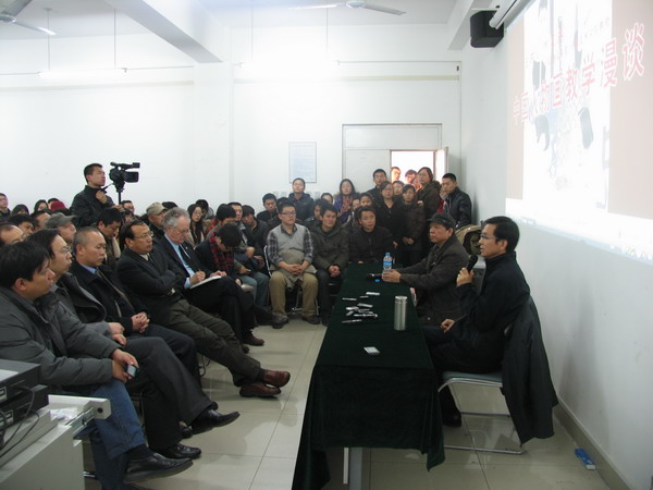 12月12日下午15时,中国美术家协会副主席、天津画院院长、天津美术学院教授、著名工笔画家何家英先生,做客我校“第三届艺术论坛”,在美术学院多媒体教室作了题为《中国人物画教学漫谈》的学术讲座。讲座由我校和省美术家协会主办,校科研处承办,来自内蒙古艺术学院和美国佛蒙特艺术家中心的客人以及美术学院300余名师生聆听了讲座。省美术家协会副主席、美术学院梁文博教授主持了这次讲座。