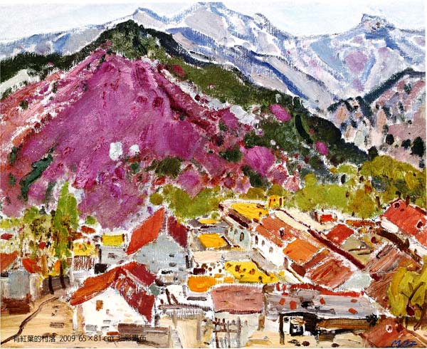 创作媒材虽源起自西方的油彩,内涵却是浑然纯属东方写意式的语汇;那国画技法里点染、皴擦技法交织出的细致线条,保留了色与色之间的微妙关系,创造一股空濛氛围,彷彿冻结了流逝的光阴,使观者共存于方框之内的场景,体悟思考艺术家所呈现的或而山林四季变化、或而柳岸又一村的寻常农舍、或而林梢游荡的浮云流光,流露出自然和谐的思维哲理。正如当地媒体报道,“用西方油画的技法,创作东方的自然山水,11幅组图,气势磅礴之外,又带有秋天的诗意。”