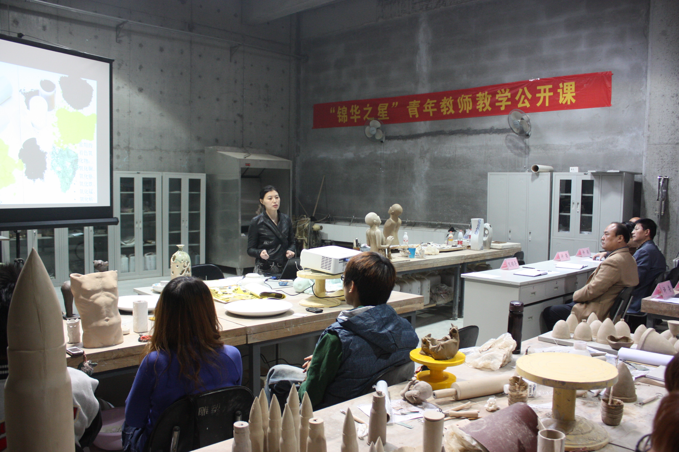 经过精心筹划与准备,我校“锦华之星”2011年度青年教师教学公开课观摩终评活动于10月10日上午9点正式拉开赛幕。美术学院青年教师白彧作为第一个参赛选手首开公开观摩课,其授课地点在美术学院陶艺实验室,讲授课程为陶艺。我校党委书记任运河,党办、院办、人事处及美术学院的相关负责人参加了观摩课。