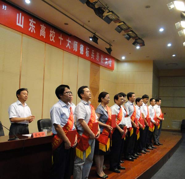 在教师节来临之际,9月8日下午, 2011年“大众报业杯”山东高校十大师德标兵表彰大会在山东建筑大学举行。山东高校工委副书记齐秀生、山东建筑大学党委书记薛允州、大众日报社副总编辑郝克远出席表彰大会并为获奖者颁奖。我校音乐学院郝益军教授荣获全省十大师德标兵称号。