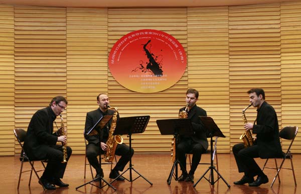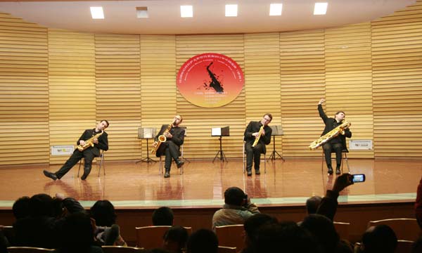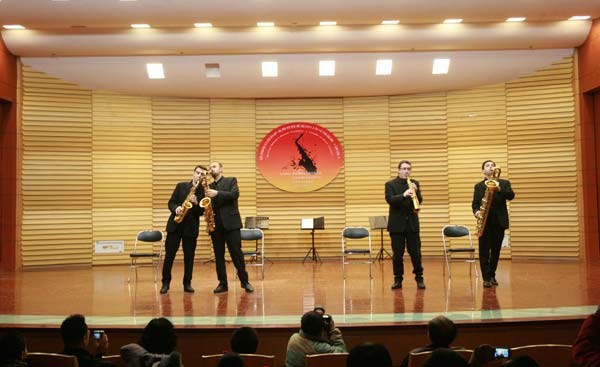 3月2日晚,我校与北京康利豪乐器有限公司、山东省国际文化交流中心、山东省音乐家协会共同主办,我校艺术实践中心、教务处、音乐学院承办的“法国哈巴涅拉萨克斯管四重奏2011年中国巡演(济南)”在山东艺术学院音乐厅成功举办。山东艺术学院党委书记柳文敏,副院长刘晓静,山东省国际文化交流中心秘书长李福平,山东电台文艺频道总监张先等领导,来自全省的管乐专业师生与音乐爱好者300余人一起欣赏了国际最高水平的萨克斯演奏。