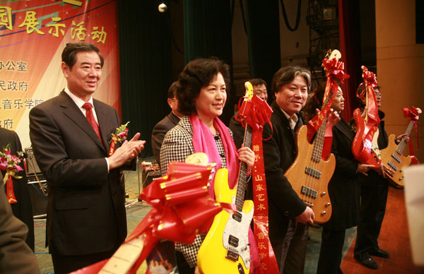 12月19日上午,省委常委、副省长王军民同志来到我校文东校区出席在这里举行的鄌郚电声乐器校园展示活动,并为“山东艺术学院音乐学院实践教学基地”揭牌。山东省人民政府办公厅副主任李世瑛、团省委副书记张辉、省中小企业办公室主任刘新风、省财政厅副厅长李国健、昌乐县委书记王树华,我校党委书记柳文敏、院长张志民陪同出席活动。