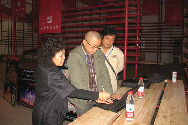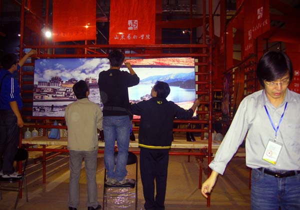 今年7月,我校接到省委宣传部关于参加文博会的工作任务。学院党委高度重视,张志民院长做出重点批示,郭跃进副院长负责组织、实施工作。时值暑假期间,艺术实践中心立即着手组织、安排展区的方案设计及各项参展工作。设计学院老师假期期间加班加点,创作出6套高质量的参展方案。经过领导、专家的论证,最终选定由设计学院张勇老师带领他的研究生李明、王振华完成的展区创意设计方案。9月下旬,文博会各项工作进入实施阶段。郭跃进副院长始终盯在工作现场,带领工作团队加班加点,确保了参展工作的顺利进行。戏剧学院秦建伟老师承担了全校综合展板的设计与创作图片的修改。工作团队成员、艺术实践中心全体工作人员放弃中秋节假期的休息时间,经过前后五天和两个通宵的连续奋战,高质量的完成了文博会的各项工作,一个创意设计新颖、内容丰富多彩的山东艺术艺术学院展区呈现在文博会广大观众面前。