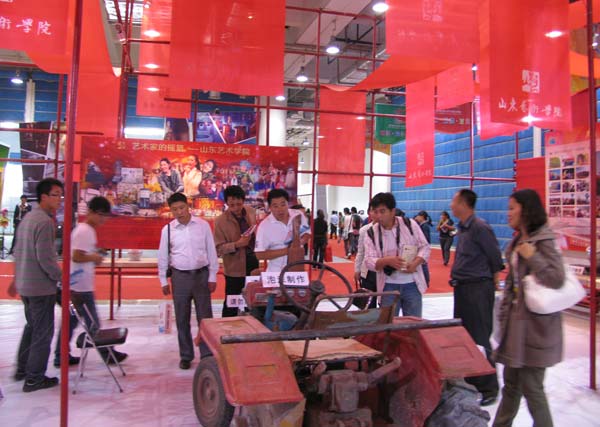 本届文博会以“创意、融合、发展”为主题,我校参加了创意设计展区的展览工作。由我校创意、设计的展区整体氛围力求简约、时尚、大气、秩序,具有较强的形式感和视觉冲击力。展区本身就是一件大型的装置艺术作品,充分体现出新颖的创意设计理念。展区展出我校共计43套共计119件作品。一幅幅展示学院成果的展板呈现在文博会上,全面展示了我校作为综合性艺术院校的办学实力。展览作品汇集我校近三年在全国性比赛、评奖中的获奖作品,形式多样,涵盖绘画、陶艺、篆刻、雕塑、舞美模型等各种类型,一件件创作获奖作品展板及实物,倾注了师生智慧和心血,展示了我校高质量的教学、科研和艺术实践成果和水平。尤其是国庆60周年山东“岱青海蓝”彩车设计展板、立体绘景《固定资产》等作品,吸引了参展观众驻足观赏,并获得高度评价。
