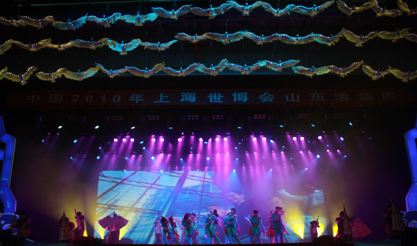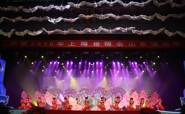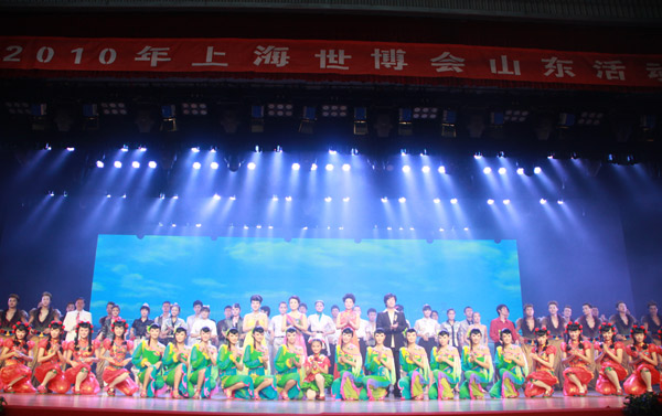 6月初,按照上级有关部门的安排,我校从舞蹈学院各班级精挑细选参演学生,抽调了10余名青年骨干教师加入演出队伍,由赵宇教授带队,投入到上海世博会山东活动周文艺演出的积极筹备和紧张排练中。在时间短、任务重的情况下,我校师生严格执行世博会山东活动周的文艺演出要求,进行严格的管理,克服种种困难,圆满完成了演出任务。《齐风鲁韵》和《相亲相爱》,一个是晚会文艺演出部分的开场,一个是结尾,在整台晚会中十分重要。由于临近期末考试,学生们学习任务非常繁重,而且排练厅条件简单,学校到彩排场地的交通也非常拥堵,所以排练演出的任务较重。为顺利完成排练演出任务,我校师生利用休息时间,加班加点,刻苦排练,从未耽误排练任务。到达上海后,师生们每天要进行三场演出,早上四点多就开始准备前往世博园,很多老师和学生都因为水土不服生病了,有的演员胃疼得夜里难以入睡,但由于第二天有演出任务,坚持带病上场。从山东到上海,从济南历山剧院排练厅到世博会宝钢大舞台,师生们时刻谨记自己肩负的是山东人民的寄托和希望,全力以赴,以完美精彩的演出为世博添彩,为山东争光,为学校争光,将最精彩的齐鲁文化、艺术精髓展示在全国观众乃至全世界观众面前。在7月8日到12日的5天时间里,我校师共为上海世博会的广大观众奉献了12场精彩的文艺演出。演员精湛的技艺,优美的身姿,浓厚的山东民族风韵,赢得了剧场观众热烈的掌声,得到了各界人士高度评价,很多现场观众在演出结束后要求与演员合影留念。
