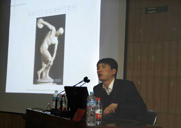 陈炎教授的讲座分为三大部分:中国和西方不同的民族心理结构、中国和西方不同的民族文化结构、中国和西方不同的民族社会结构。他从古希腊的酒神和日神崇拜现象入手,通过对酒神与道家的感性倾向、日神与儒家的理性取向之间差异性的比较,归纳概括了中西方文明的结构性差别。他认为,从民族心理结构方面看,西方的酒神或日神崇拜分别导致其偏于感性或理性的极端,而中国的道家和儒家学说也倾向于感性或理性却不偏执而是互补;从民族文化结构方面看,西方先人本能地热衷于感性狂热的“体育”活动或理性超越的“科学”思维与探索行为,而中国古人则细腻地沉浸于感性和理性相结合的修身齐家的“艺术”行为中或经世致用“工艺”创造中;从民族社会结构方面看,西方社会建基于“自由”和“法律”两者的让渡平衡中,中国社会立足于“道德”和“政策”的双向制约中。他还特别强调指出,正是由于这种源自历史传统的不同根源,导致了中国和西方在文化、艺术方面的明显不同,即日神和酒神精神的对立导致西方文化的“泛科学”乃至“泛哲学”与“泛体育”化的两种倾向,而儒家和道家的互补则决定了中国文化的“泛艺术”和“泛礼教”化相结合的取向。而当代社会的发展,更需要中国和西方文化的相互借鉴和互补,因为,一个民族的优点常常正是它的弱点,一个民族的短处又往往恰是它的长处。