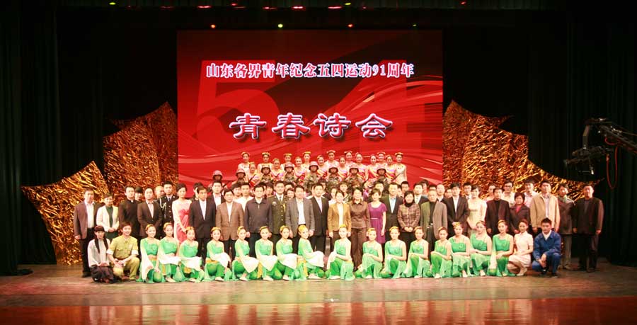为继承和弘扬五四精神,教育引导全省广大青少年勇担历史使命,努力为经济文化强省建设作贡献,4月29日晚,由团省委主办、我校团委承办的山东各界青年纪念五四运动91周年青春诗会在我校文东校区综合楼艺术剧场举行。我校党委书记柳文敏、院长张志民、党委副书记朱德强与团省委书记王磊,省委高校工委副书记邢善萍,团省委副书记孙爱军、张涛、任海涛、张辉,省直有关部门负责同志、省内各大新闻媒体以及驻济各界青年代表共计800余人一同观看了演出。