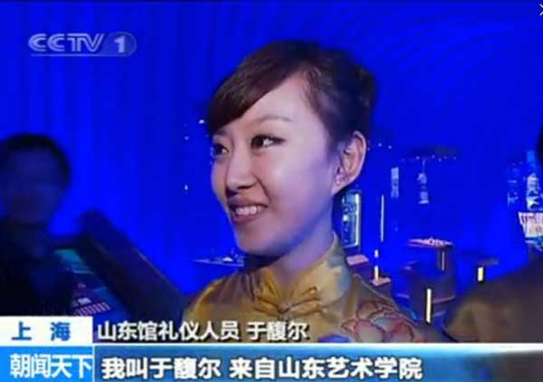 “我是于馥尔,来自山东艺术学院。”“我最大的愿望就是希望山东的人都来观看,欢迎全国的人都来我们的山东馆。”4月20日,上海世博会“山东馆”首次试运营,作为馆内礼仪人员的代表,我校学子面对央视镜头,向世界发出了热情的邀请。