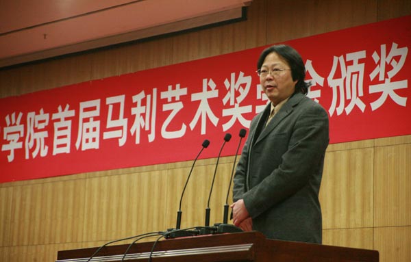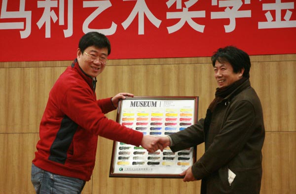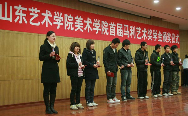 3月16日上午,我校美术学院首届马利奖学金颁奖仪式在长清校区图书馆报告厅举行。张志民院长和王力克副院长出席了颁奖仪式,并为获奖同学颁发证书和奖杯。马利公司副总经理徐文富先生一行三人、金艺画廊代表、美术学院学术委员会的老师们以及美术学院2007、2008级的同学们参加了颁奖仪式。
