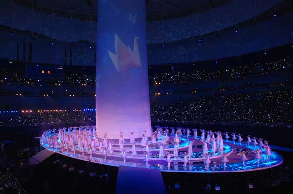 第三篇《星空》之歌舞《放飞》。《放飞》是在全运会圣火熄灭后表演的第一个节目,虽然圣火暂时熄灭,但四年之后将被重新点燃。它预示着生命不息,拼搏不止,超越个人的力量,有梦想就要展翅飞翔。