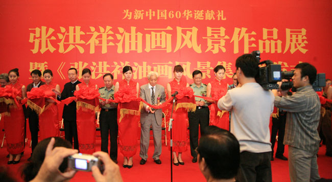 20日上午10时,在装扮得喜庆热烈的省博物馆一楼大厅内,张洪祥油画风景作品展暨《张洪祥油画风景作品集》首发式在这里隆重举行。山东省文联党组书记、副主席于钦彦,山东省文联主席潘鲁生,济南军区政治部主任王健,中国油画学会副主席、著名油画家全山石,我校党委书记柳文敏、院长张志民及来自艺术界的知名人士共16人在主席台就座,为画展的顺利开展剪彩祝贺。