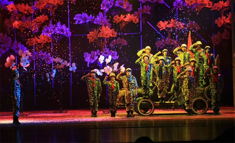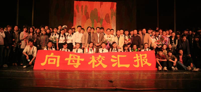 10月12日晚,青岛话剧院海尔儿童艺术剧团携该团大型青春校园剧新作《向前向前》在山东剧院进行来济的首场演出。三十余名山艺校友用汇报演出的形式,向母校进行了深情的问候,向祖国的六十华诞献礼,为即将召开的十一届全运会喝彩加油。山东省文化厅副厅长周艺,我校党委书记柳文敏、副院长王力克到场观看了演出,并对演出的圆满成功表示热烈的祝贺。